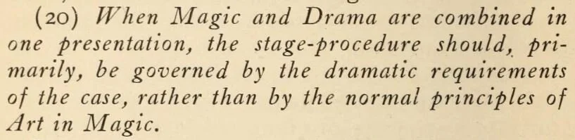 20: When Magic and Drama are combined in one presentation, the stage-procedure should, primarily, be governed by the dramatic requirements of the case, rather than by the normal principles of Art in Magic.